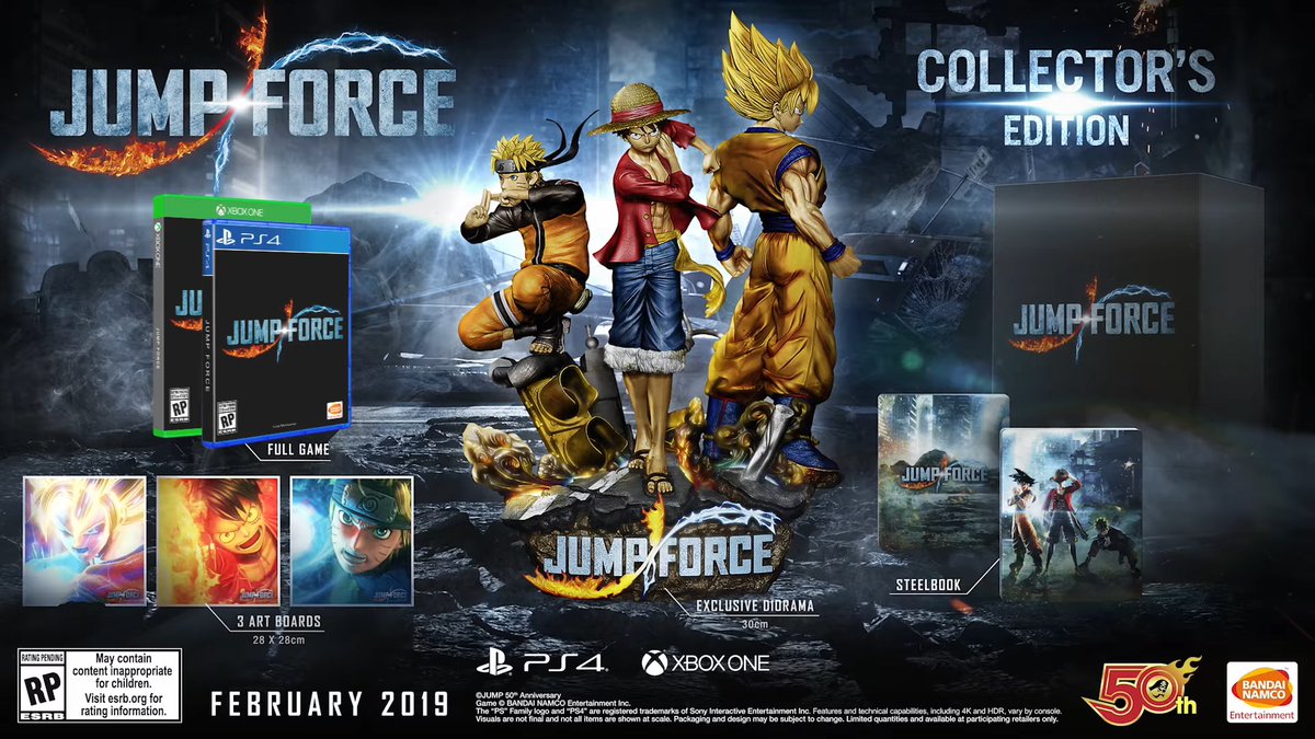 If that’s not enough news for you, we have plenty more. The game will feature nine DLC characters after launch. Players who pre-order Jump Force will receive the following bonuses: 3 exclusive costumes along with 1 vehicle. There will also be a $260 collector’s edition for the game. Players who purchase this edition will receive a steel book, three art boards, and an exclusive diorama statue of Goku, Luffy and Naruto.