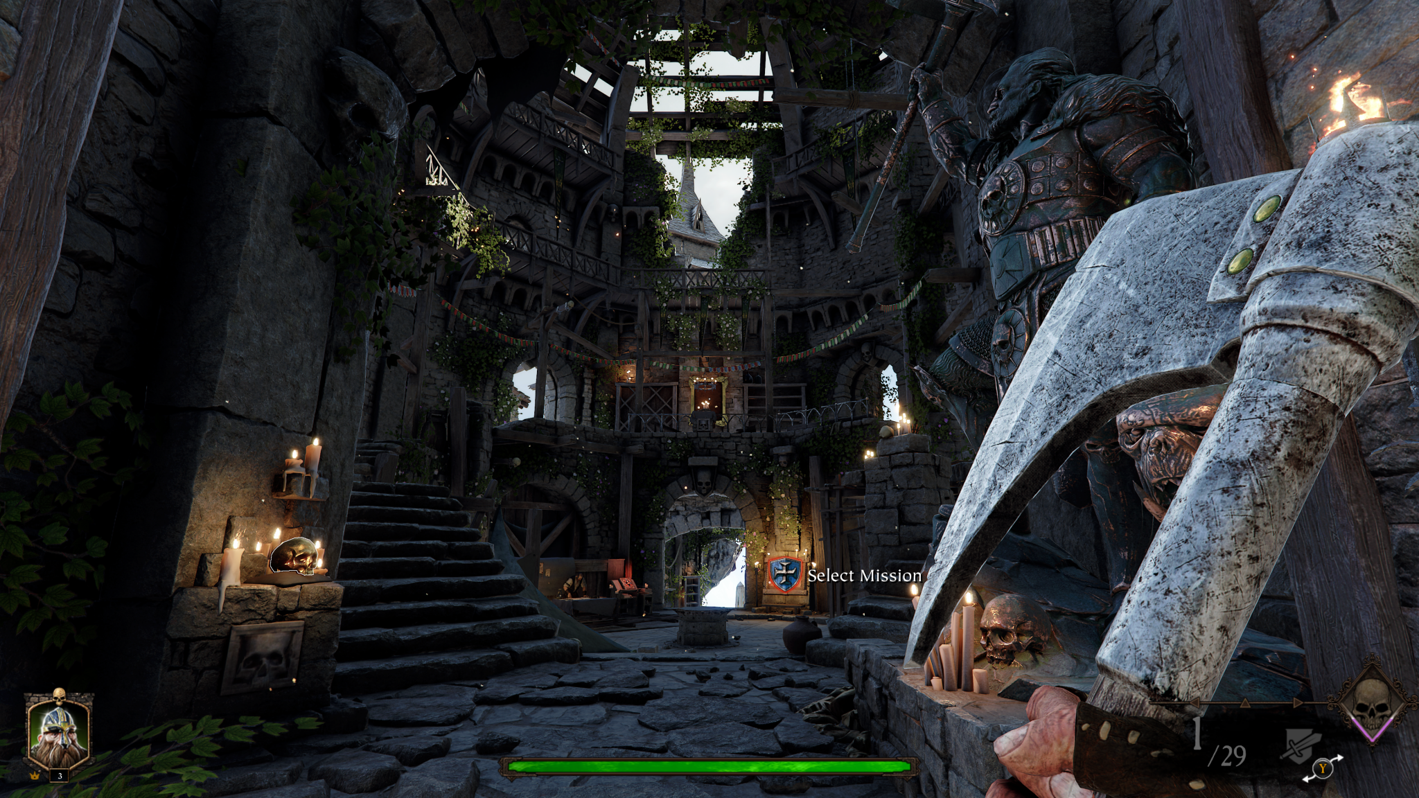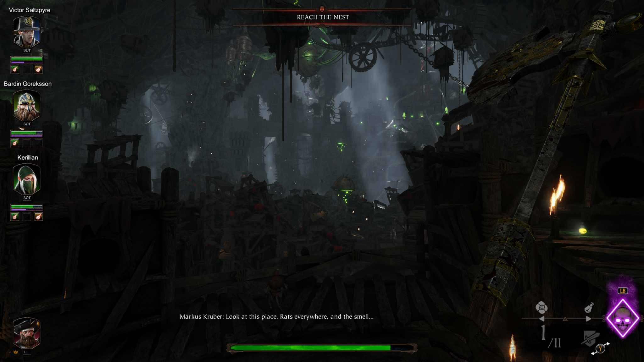 Warhammer: Vermintide II follows of the events of the first game, Vermintide: The End Times. After the five heroes of Ubersreik were broken up, they are reunited when Grey Seer Rasknitt captures them in his stronghold (He is the main villain of the first game, thought to be dead but it looks like he is still alive and kicking). Grey Seer Rasknitt is the leader of Clan Fester, and this time around joins forces with Chaos Champion Bödvarr Ribspreader and his army of Rotbloods. Together they work on the construction of the Skittergate, which would allow the entirety of the Rotblood army to travel to Helmgart, one of the last remaining cities still struggling to stay alive in this treacherous time. During the tutorial of the game, you start out as Markus Kruber, a empire mercenary who is caught in a cage. You watch as the Skittergate collapses from a major malfunction, and your characters cage drops down and smashes open, freeing you from a potentially horrific fate! You then proceed to free the rest of the Heros of Uberskreik, fighting your way along, learning your abilities and controls of the game. After a hectic adventure, you escape through a portal and end up in a safe haven inside a ruined keep which becomes your hub before each mission.